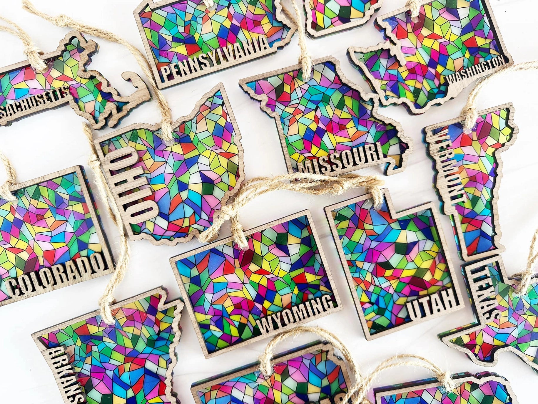 Stained glass state ornaments. Width & length varies by state (see below), 1/4 inch thick, double layered and finished with twine. Each state sold separately. Pattern placement varies.
