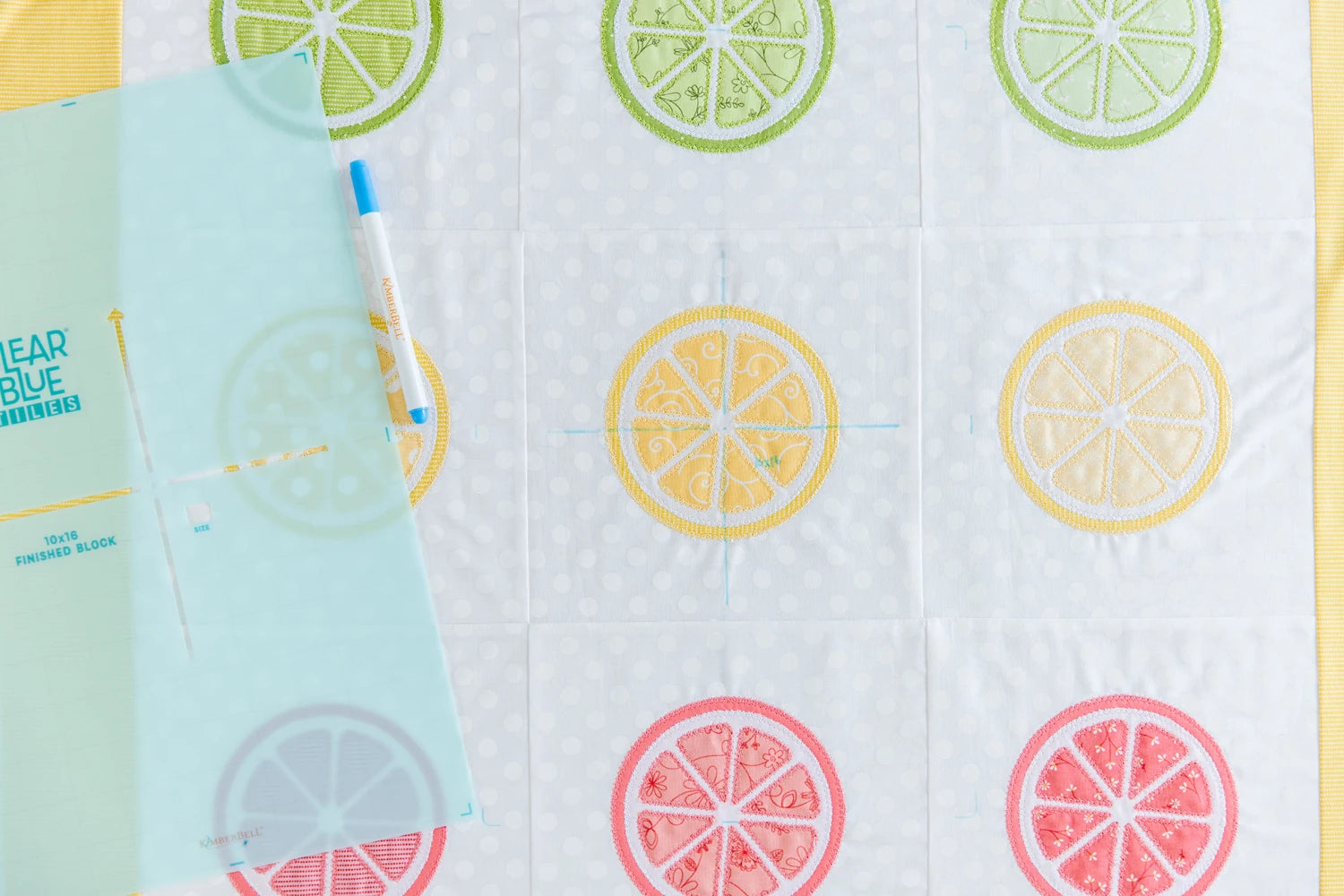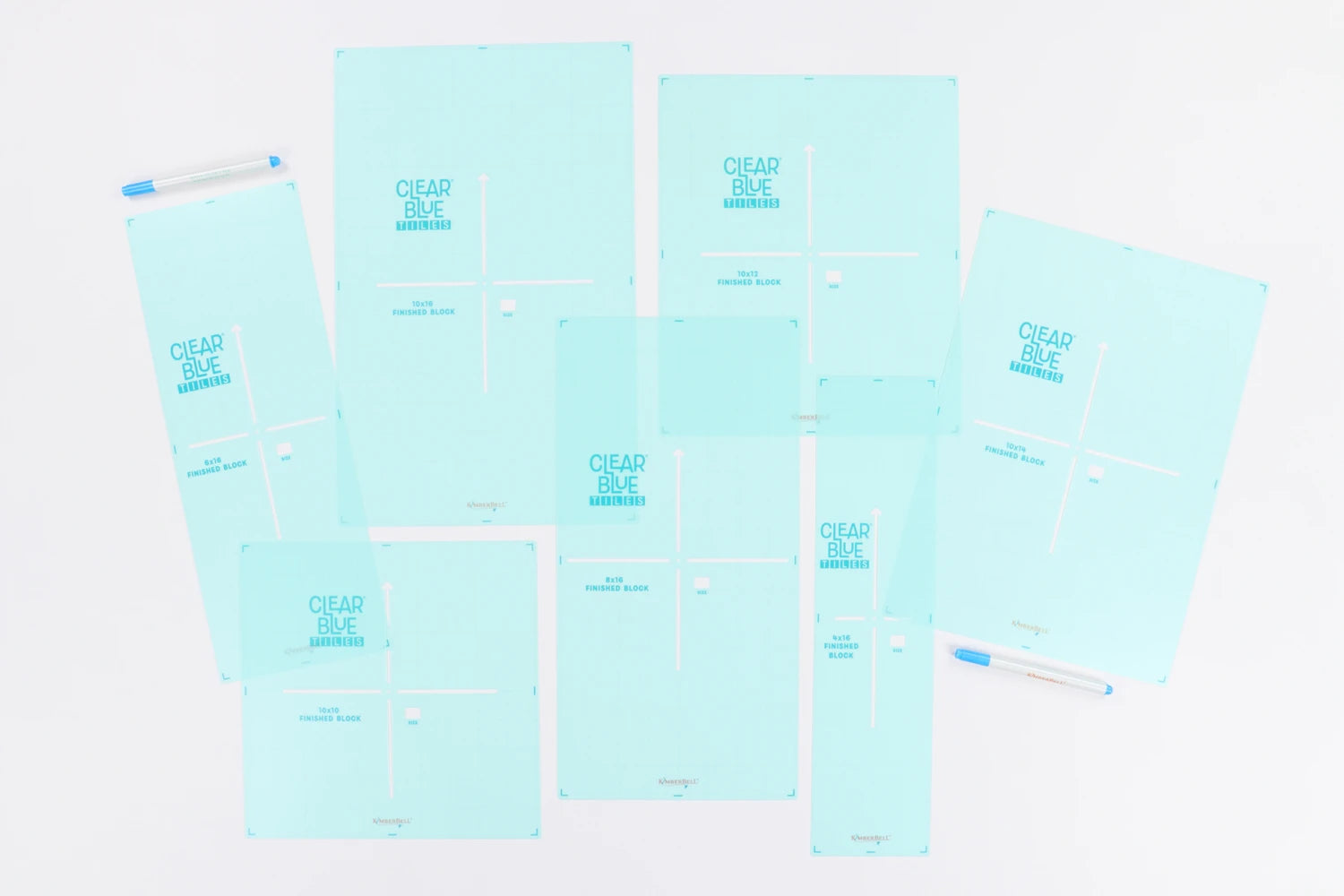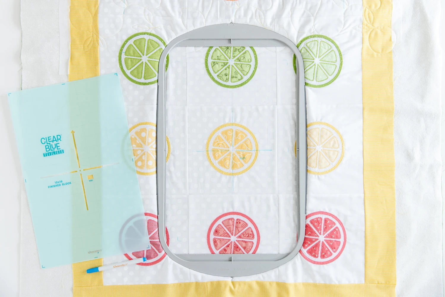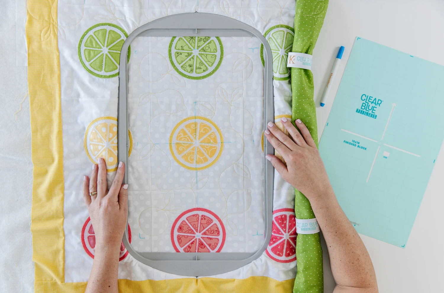 Kimberbell Clear Blue Tiles® are now bigger than ever! Our Expansion Set 2 includes 10x10, 10x12, 10x14, 10x16, 4x16, 6x16, and 8x16 sizes perfect for the very largest embroidery machine hoops. Use with Kimberbell’s designated large-scale background quilting designs and mix and match with 4x4 and larger tiles from your Clear Blue Tiles Essentials and Expansion Sets! With our Expansion Set 2, quilting large projects on your home embroidery machine has never been easier.