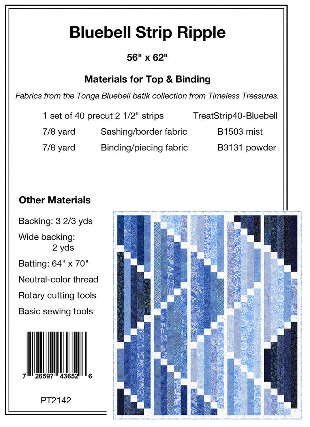 A single set of 2 1/2" precut strips with added fabric for sashing, borders and binding. Large rectangles and squares take care of the piecing. Fabrics shown from the Tonga Bluebell batik collection from Timeless Treasures. Skill Level: Confident Beginner