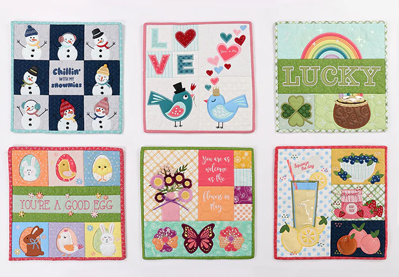 Create seasonal gifts and decor with Kimberbell Mini Quilts, Vol. 1: January-June! Made in 5x7 (and larger) hoops, each 12 x 12” mini quilt celebrates the first half of the year with darling techniques and beautiful blocks. Stitch each block on your embroidery machine, add optional background quilting (sold separately), and sew the blocks together on your sewing machine! From snowmen and shamrocks to lovebirds and more, Kimberbell Mini Quilts are always in season.