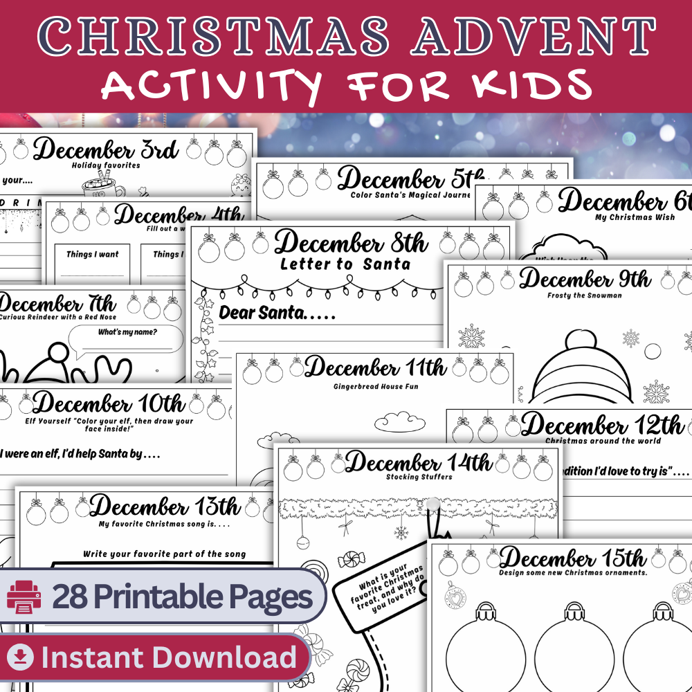 Unwrap the holiday spirit with our Christmas Advent Activity for Kids! This 28-page pack is perfect for keeping little ones entertained while spreading joy. Get festive with this printable activity pack.