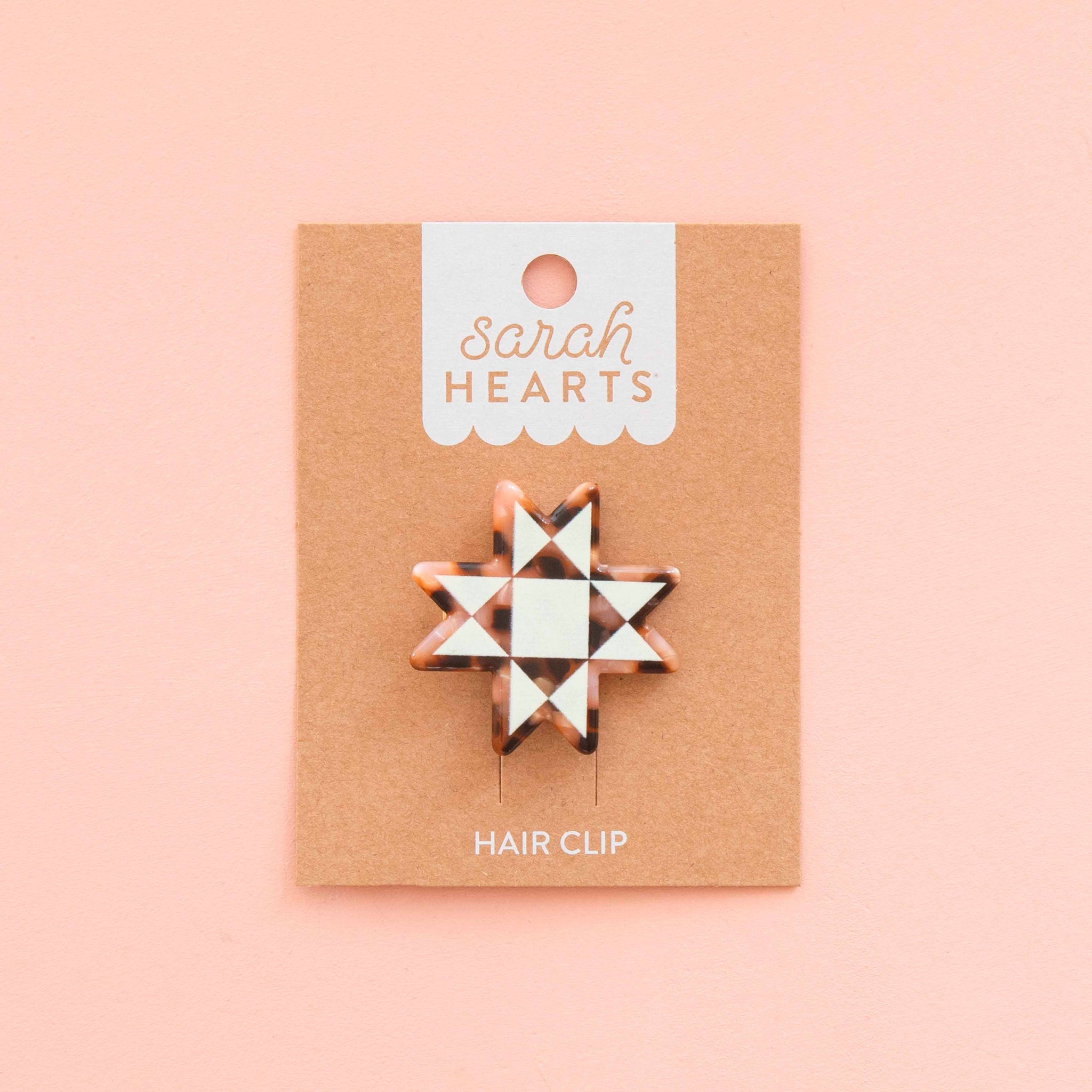 Elevate your hair game with our Quilt Star Hair Clip, inspired by the timeless sawtooth star quilt block. Featuring a chic blend of brown and blush pink tortoise shell with a cream screen-printed design, this petite barrette brings a modern twist to a classic motif. Crafted from plant-based acetate and secured with a gold alligator clip, it’s as stylish as it is sustainable. Whether you’re heading to a quilt guild meeting or just love a handmade touch, this clip is the perfect accessory for any sewist or maker on the go.